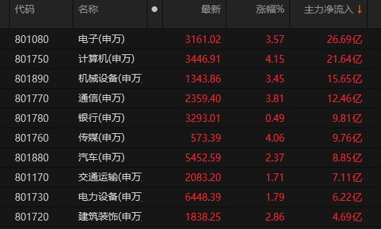 上证报中国证券网讯截至4月17日上午收盘,在申万一级行业板块中,正规股票配资电子、计算机及机械设备板块的主力资金净流入额位居前三。