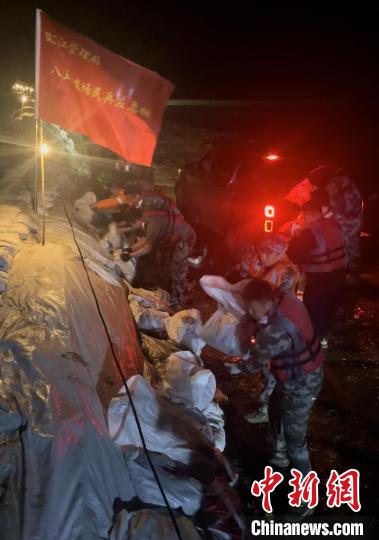 当地抗洪人员对发生险情的大堤及时进行加固。鲁明摄