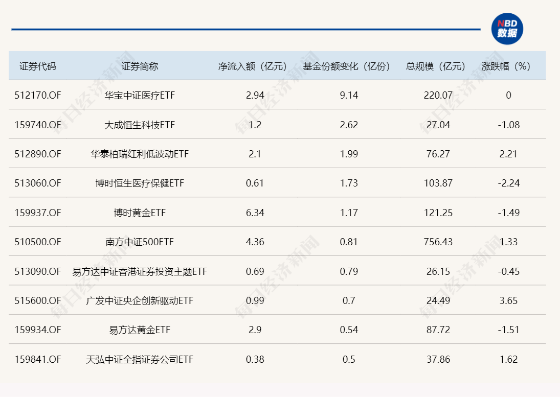 Wind数据显示,在4月15日的非货币ETF市场中,华宝中证医疗ETF、大成恒生科技ETF、华泰柏瑞红利低波动ETF份额分别增加了9.14亿份、2.62亿份和1.99亿份,分别净流入2.94亿元、1.2亿元和2.1亿元。