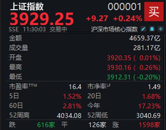 12月24日,A股震荡攀升,截至上午收盘,上证指数涨0.24%报3929.25点,深证成指涨0.31%,创业板指涨0.08%,北证50涨0.18%,科创50涨0.29%,中证A500涨0.07%,A股半日成交1.16万亿元。